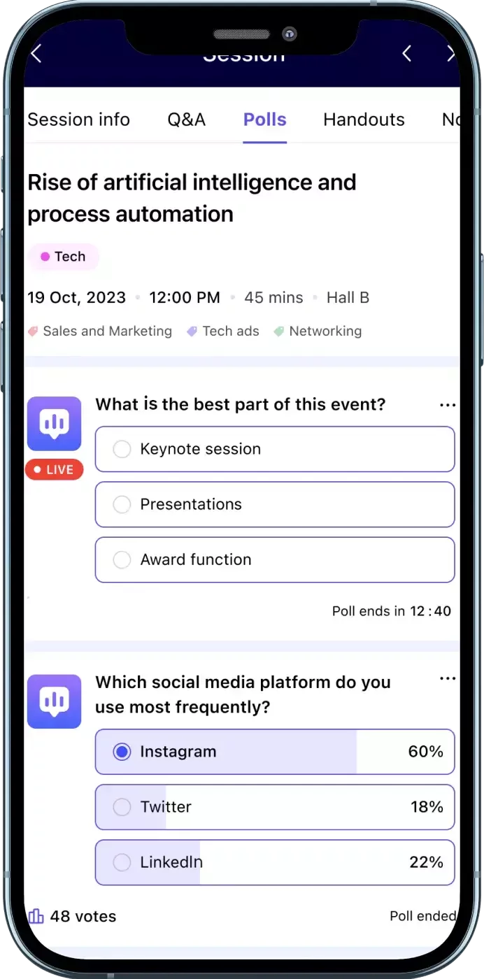 Drive engagement during sessions by enabling your attendees to follow presentations and ask questions without interrupting the session. Answer polls, like slides, and give feedback—all from the mobile app.
