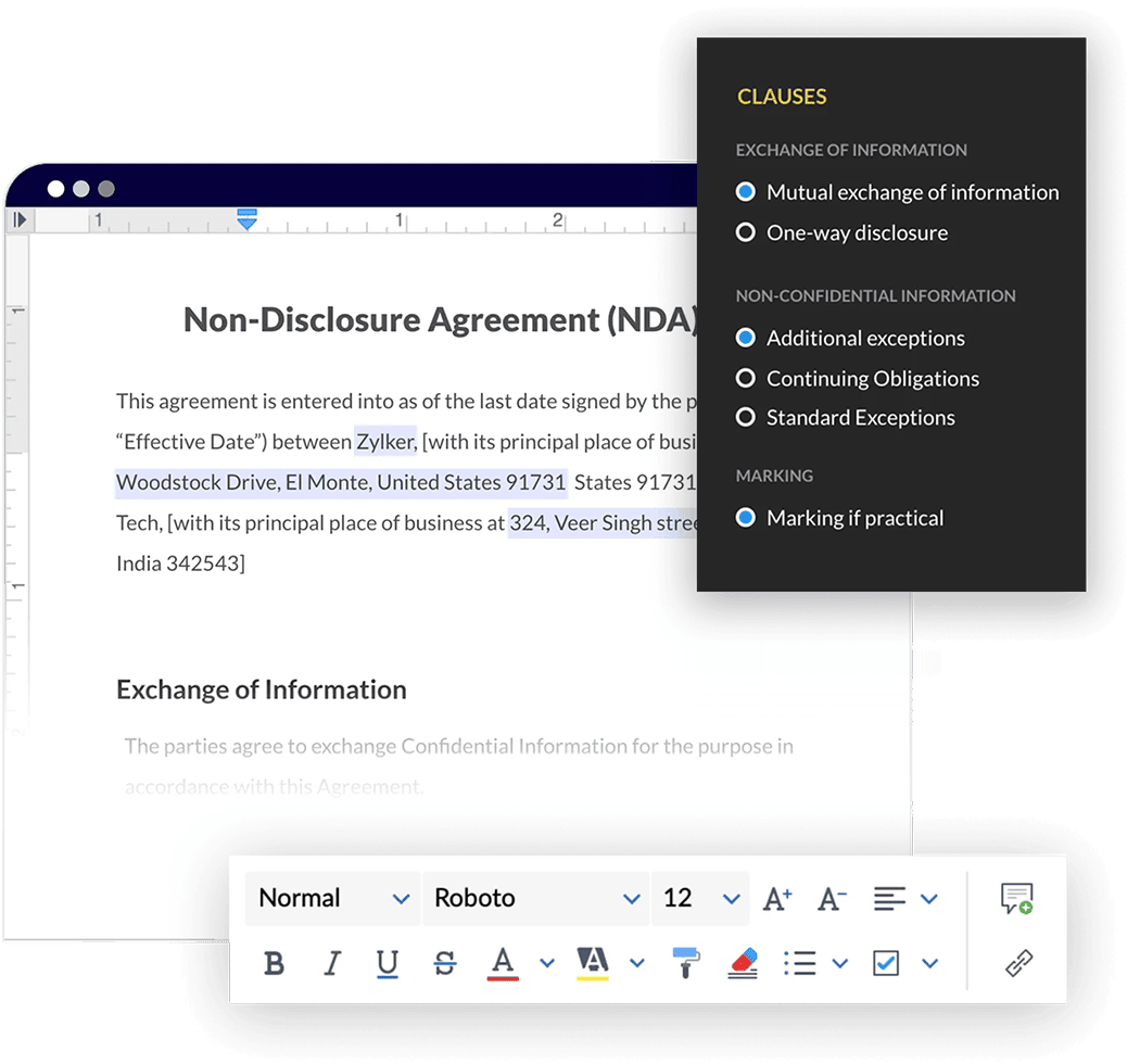 The AI assistant in Zoho Contracts helps you draft contracts fast. It identifies and suggests missing clauses, simplifies legal jargon, flags potential risks, and discovers contractual obligations, helping you draft risk-free contracts.