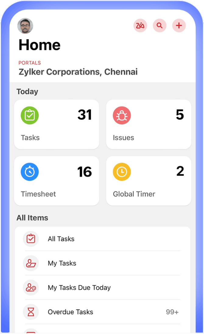 Log billable and non-billable hours with the Projects timesheet module. Record every minute of your hard work, either manually or with timers, and our built-in integration with Zoho Invoice will automatically generate invoices from your timesheets.